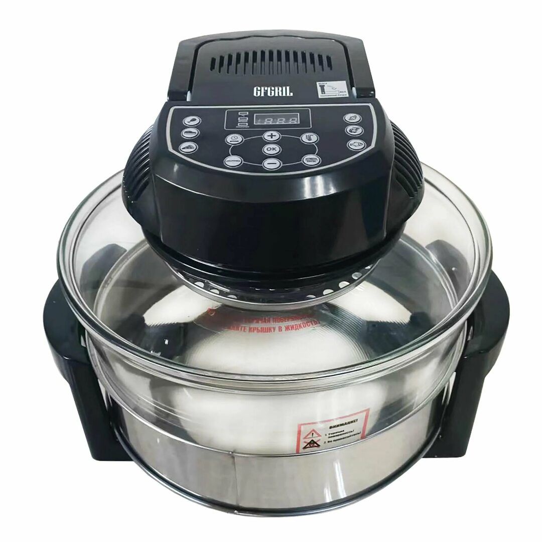 GFGRIL GFA-GL17D — классический аэрогриль со стеклянной чашей большого объема, который с расширительным кольцом достигает примерно 17 литров. Такой формат подойдет для большой семьи или тех, кто часто готовит большие порции. Галогенный нагреватель и циркуляция воздуха позволяют запекать крупные куски мяса и птицу, а функция самоочистки упрощает обслуживание устройства.