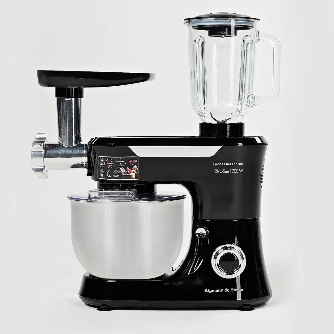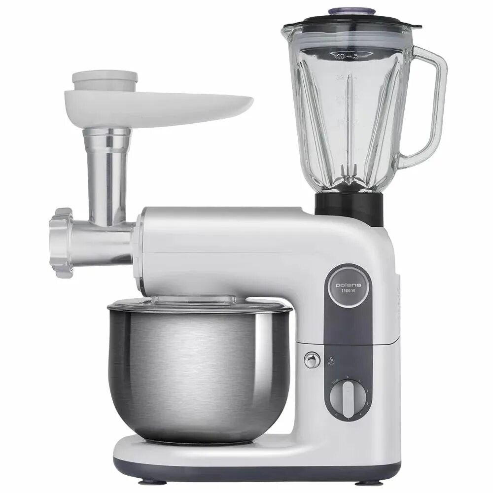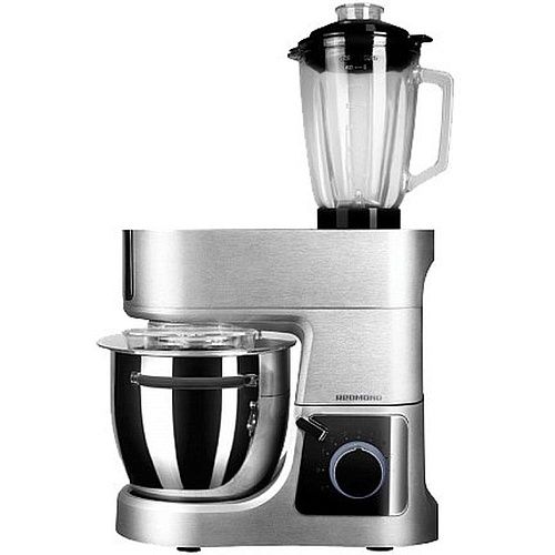 Многофункциональная кухонная машина с двигателем 1600 Вт и основной чашей из нержавеющей стали объемом 3,9 л. Комплектуется 7 насадками: планетарный миксер, мясорубка с металлическими решетками, блендер 1,5 л, диск для нарезки, диск для шинковки, венчик и крюк для теста. Уровень шума при работе — 65 дБ.