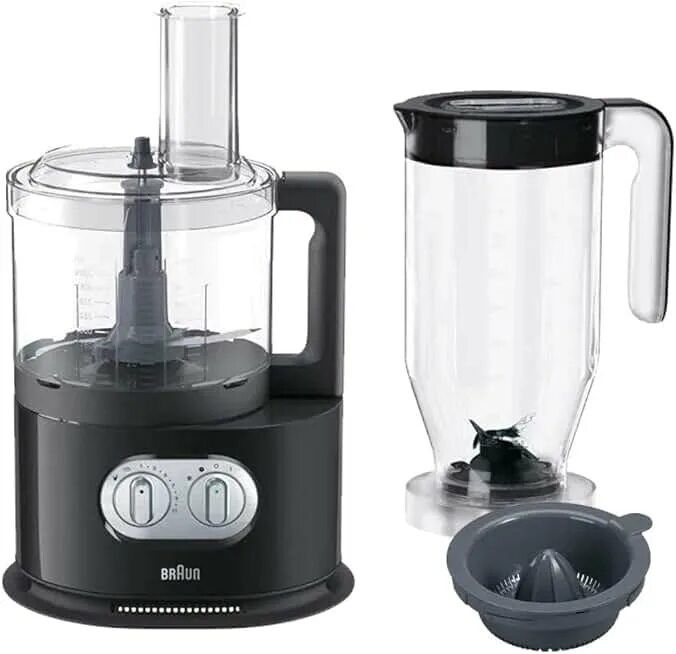 Модель мощностью 1300 Вт с запатентованной системой PowerChop — S-образные ножи из нержавеющей стали с зубчатой заточкой. Основная чаша 2,1 л, мини-измельчитель 0,5 л, блендер 1,5 л. Три фиксированные скорости плюс импульсный режим. Широкое загрузочное отверстие 73 мм позволяет загружать целые яблоки и огурцы.
