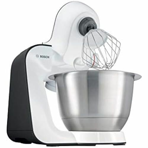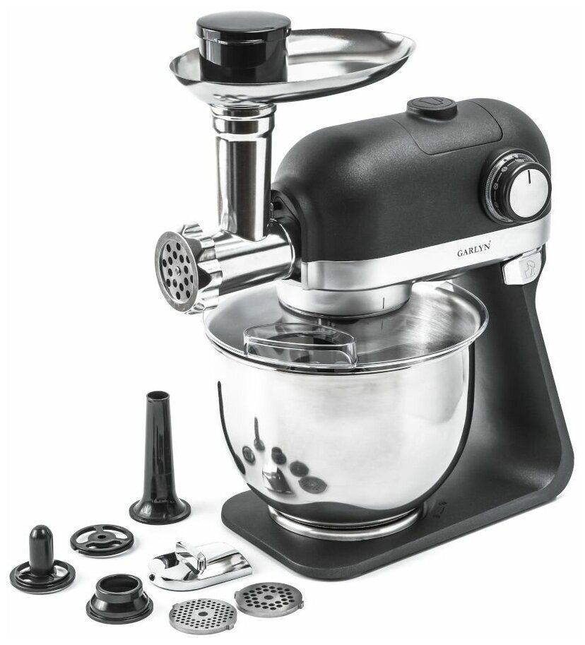Планетарный миксер мощностью 1000 Вт с чашей из нержавеющей стали 3,9 л и крышкой от разбрызгивания. Семь уровней скорости с электронным управлением. В комплекте: насадка-крюк для дрожжевого теста, венчик для белков, плоский венчик для песочного теста, дисковая терка (3 диска), мясорубка.