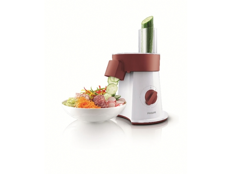 Большая горловина позволяет загружать целые овощи, что экономит время на подготовку. Прибор действительно лёгкий — самый лёгкий среди всех протестированных моделей. Не греется даже при длительной работе, что говорит о качественной системе охлаждения. Ещё один плюс — диски совместимы с другими моделями Philips, можно докупать насадки отдельно.