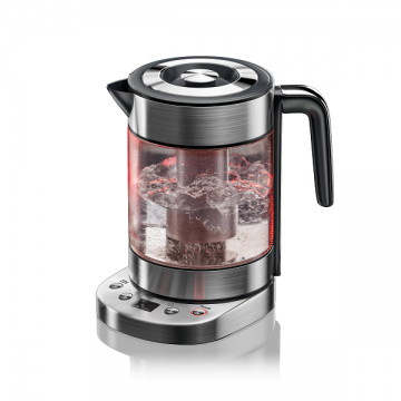 Стеклянный чайник с пятью температурными режимами и цветной подсветкой, которая меняет оттенок в зависимости от выбранного режима. Функция поддержания температуры работает до 2 часов.